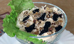 Отварить две куриные грудки. 6 ягод чернослива без косточек замочить в горячей воде на 10 минут, отжать. Отварить вкрутую 2 яйца (оставляем 1 желток). Все приготовленное – курицу, чернослив, яйца, а также два свежих огурчика мелко режем, добавляем измельченные пучок укропа, пару веточек петрушки и перемешиваем, заправляем оливковым маслом, специями. Сверху салат посыпаем измельченными грецкими орехами (1 шт)